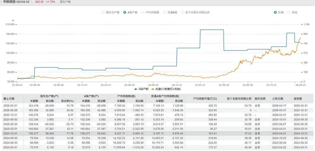 中际旭创A股股东户数近期变化。来源:Wind