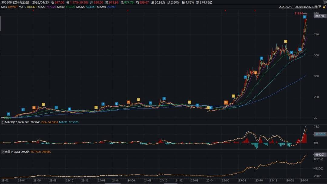 今天早盘,中际旭创股价拉升走强,盘中股价一度创下历史新高,报919.99元/股,市值达1.01万亿元,市值历史首次突破1万亿元。截至收盘,中际旭创股价报897元/股,较前一个交易日上涨1.17%,总市值9989亿元。