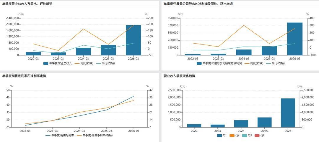 今年一季度,中际旭创营收、净利润,创下公司单季度历史最高纪录,营收194.96亿元,同比增长192.12%,环比增长近50%;扣非归母净利润57.18亿元,同比增长264.56%,环比增长近60%。