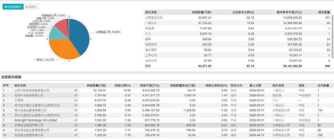 中际旭创全球股东持仓汇总。来源:Wind