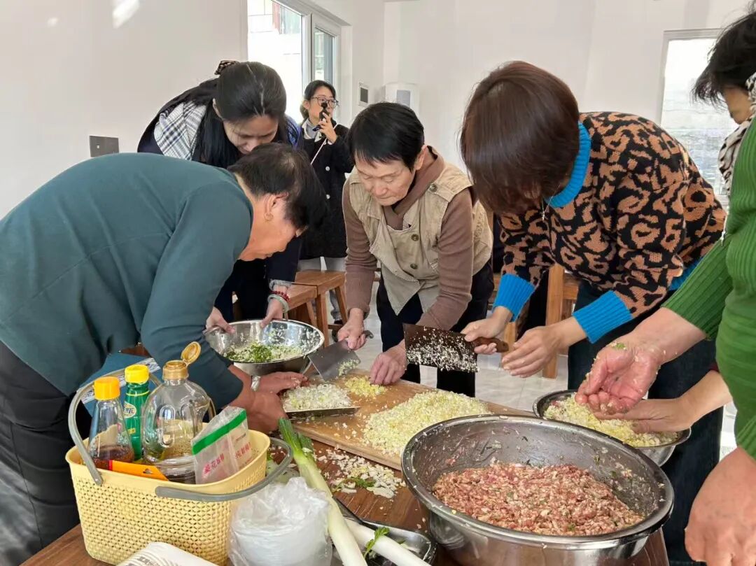 上午九点,黄泥沟活动室内欢声笑语、暖意融融。长桌整齐排列,面粉、饺子皮、新鲜的猪肉白菜馅、葱姜蒜末等食材摆放得琳琅满目,十几位老人围坐在一起,大家迅速分工协作,纷纷亮出拿手技艺,有的调馅,有的揉面擀皮,手法娴熟地将面团变成一张张薄而圆的饺子皮;有的专注包饺子,手指翻飞间,一个个形态各异却同样饱满的饺子便摆满了托盘。大家一边包饺子,一边分享着生活中的趣事,偶尔还会互相“切磋” 包饺子技巧,空气中弥漫着面粉的清香与温馨的氛围。