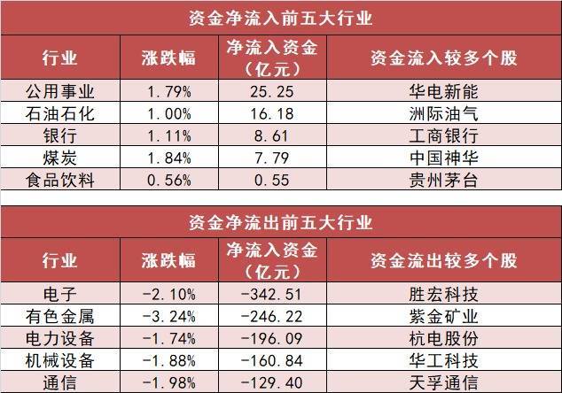 申万一级行业中,5个行业实现资金净流入,其中公用事业行业净流入25.25亿元居首。