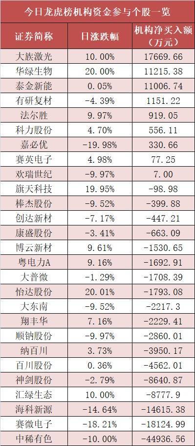 盘后龙虎榜数据显示,机构现身多股,其中大族激光等股票呈现机构资金净买入,中稀有色等股票呈现机构资金净卖出。